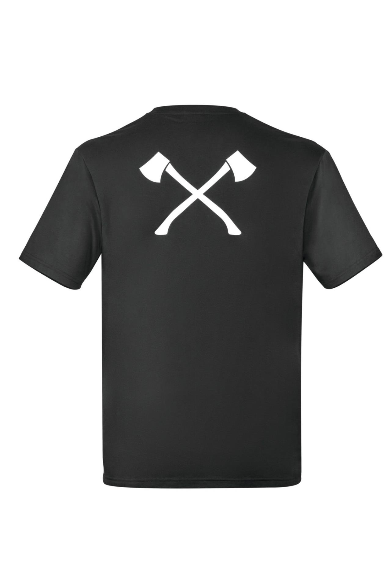 Schwarzes T-Shirt aus Bio Baumwolle zum 40-jährigen TIMBERSPORTS® Jubiläum. Vorne auf der Brust befindet sich ein Jubiläums-Logo-Badge und der geduckte Schriftzug des Sponsors Uhlsport. Den Rücken ziert ein weißer Druck mit den für TIMBERSPORTS® typischen gekreuzten Äxten.